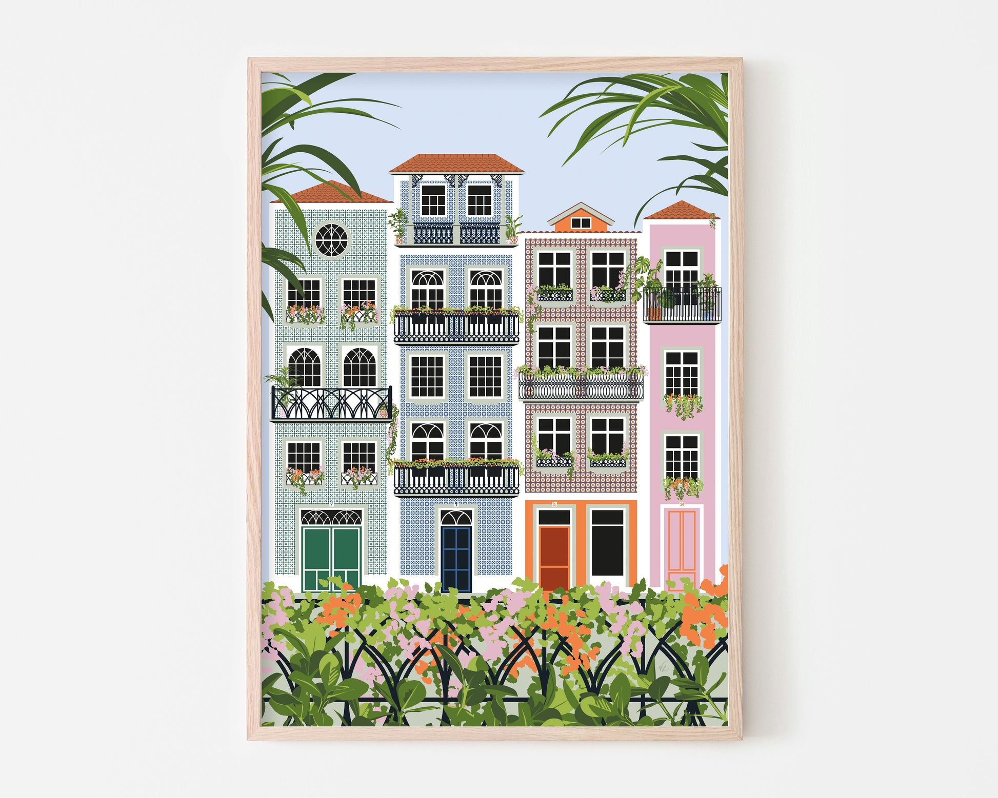 An illustration print of a street of Portuguese tiled houses overflowing with plants in the sunshine. Perfect for your travel and plant enthusiast loved ones.